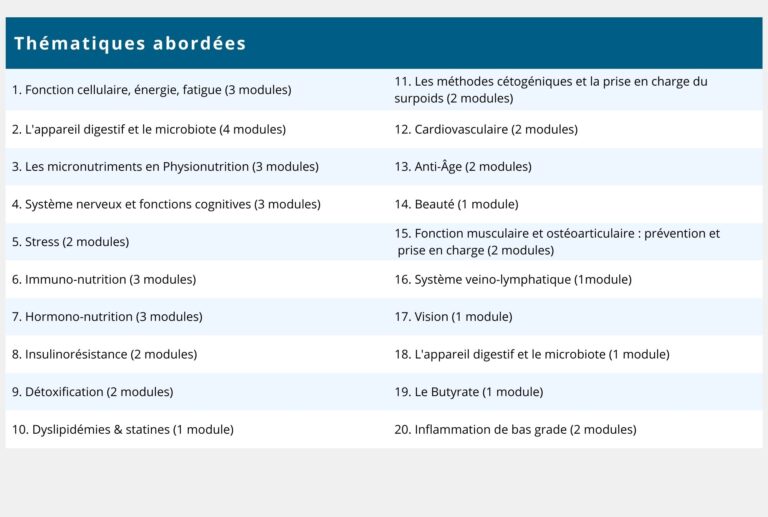- Revoir les notions de physiopathologie, acquérir ou actualiser vos connaissance en Physionutrition